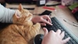 A person using a desktop computer with a cat lying