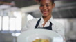 Young female portrait smile present food dish cook in the moden kitchen - 4K stock video