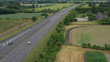 Drone view of the A81 motorway, amidst fields with farms, on a spring day in May 2025, in the Mayenne department, France
