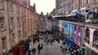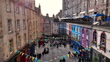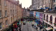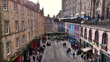 Aerial view of the famous colorful Victoria Street in the Old Town of Edinburgh, Scotland, England, Victoria Street in the United Kingdom, Victoria Street in the old town in Edinburgh Scotland England Crowds of tourists on the Royal Mile,harry potter city - 4K stock video