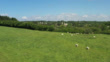 Drone view of a herd of cows in a meadow, with a village with a church steeple, in May in Normandy, France