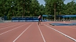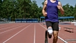 Dolly shot of coach timing amputee runner with prosthetic leg sprinting on track at outdoor stadium in slow motion