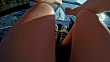 Point of view shot of the arms and legs of an athlete sculling on a lake in sunshine. Shot in Slovenia.