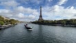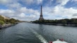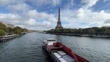 PARIS, FRANCE - OCTOBER 22: A boats heads down the Seine river with Eiffel tower in the background on October 22, 2023 in Paris, France. Paris will host the Summer Olympics from July 26 till August 11, 2024. (Footage by David Ramos/Getty Images)