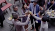 Business people toasting drinks, socializing at party on patio. MS, tilt down, real time.