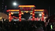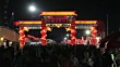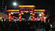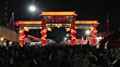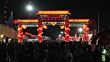 Chinese dragons and neon lights illuminate an arch as a crowd gathers for the Chinese New Year.