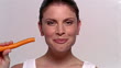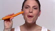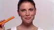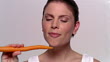 Close up woman biting into carrot and smiling at camera - HD stock video