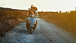 Closeup front view of mid 20's couple cruising on a scooter bike through coutryside landscapes. They are enjoying the ride and doing some sight seeing. 4k