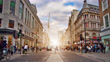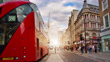 Creative Sunset in London. Red Bus. Retro Style Building - 4K stock video