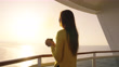 Cruise luxury travel lifestyle woman watching sunrise on private balcony deck and drinking coffee at the sunny morning. - 4K stock video