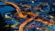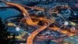 Digital network connection line between building over express way with traffic light at the Bergen cityscape at the sunset time, Time lapse clip, Technology and Futuristic concept, 4k clip
