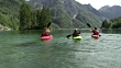 HD1080p: High Angle shot of parents with one child kayaking on the lake. Lago del Predil, Italy, Europe