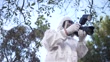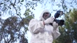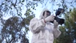 Male forensic scientist photographing evidence with a camera at crime scene in the woods.