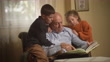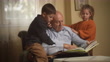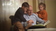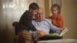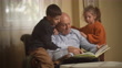 Old man reading stories to his young grandson and granddaughter in living room at home
