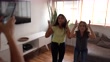 Mother filming teenager daughters dancing at home