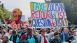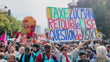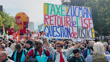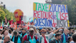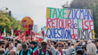 PARIS, FRANCE - OCTOBER 2: A protester holds a sign that reads "Zucman Tax, Return of the Wealth Tax, A Matter of Justice" at the head of the procession during demonstrations on October 2, 2025 in Paris, France. Unions across France have launched a second round of nationwide strikes following unsuccessful negotiations with Prime Minister Sébastien Lecornu over austerity measures and proposed pension reforms. While transport and education sectors are expected to experience significant disruptions, other services are anticipated to operate with minimal impact. (Footage by Photo and Co/Getty Images)