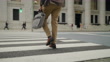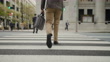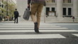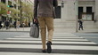 A rear view video of a businessman crossing the street in a financial district in the city.