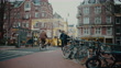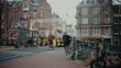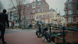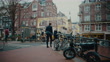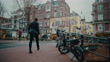 Slow motion rear view of male commuter with bag walking on bridge with buildings in background in city at Amsterdam,Netherlands