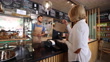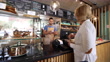 Senior woman purchasing desserts at a bakery paying with credit card while friendly waiter holds the credit card reader behind the counter - 4K stock video