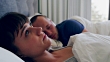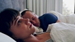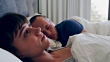 4K video footage of a young woman looking upset while her husband sleeps in the bed next to her